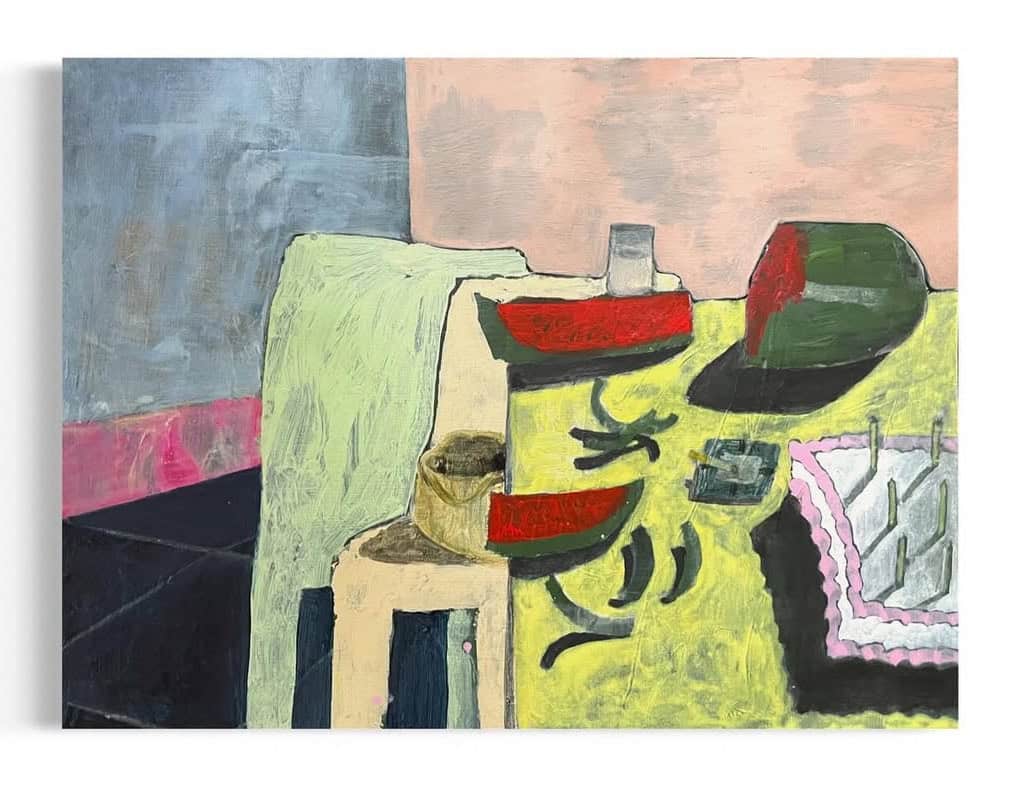 “Still Life With Cake”, Acrylfarbe auf Papier und Holz, 2023, Courtesy die Künstlerin