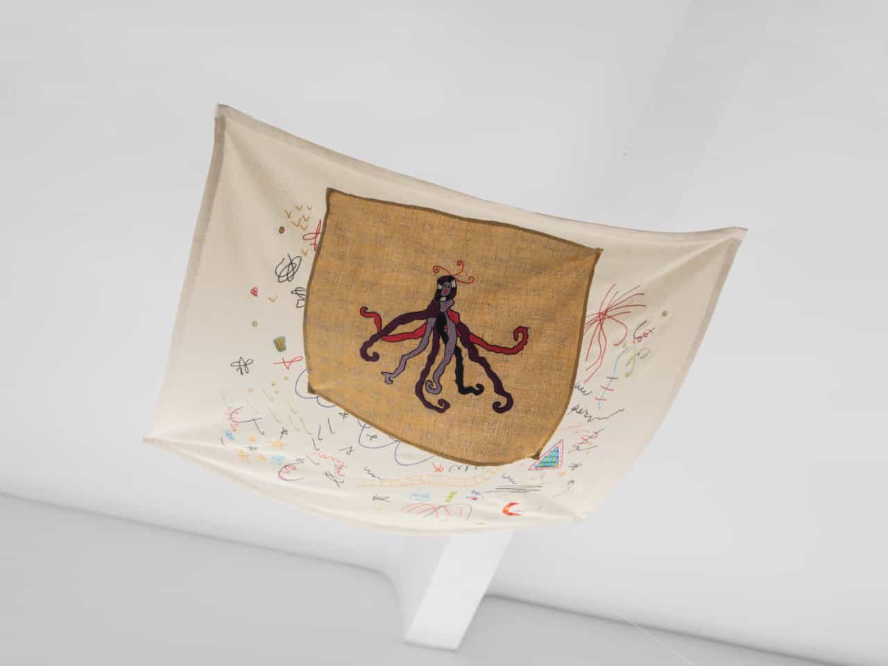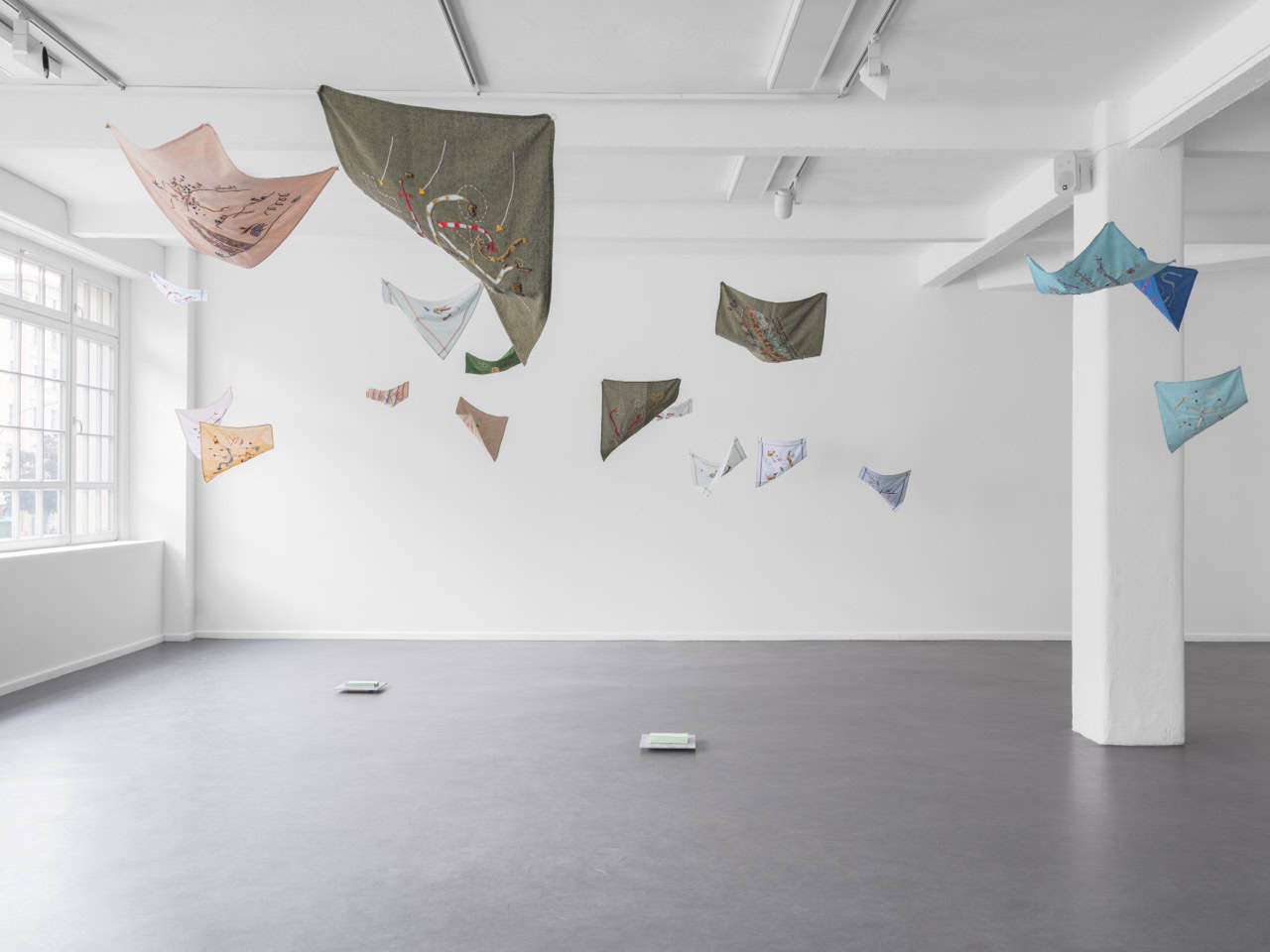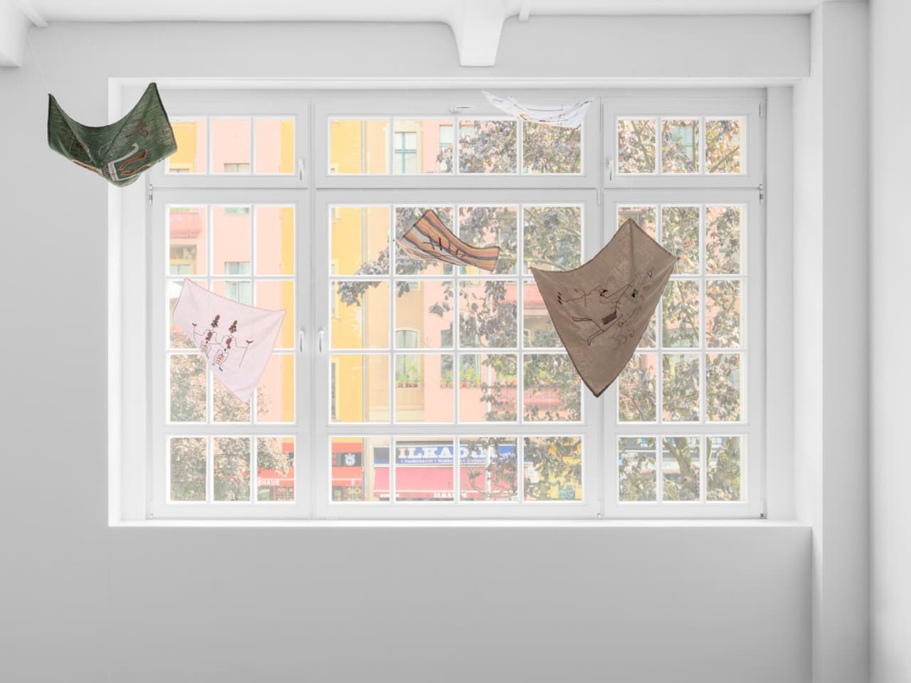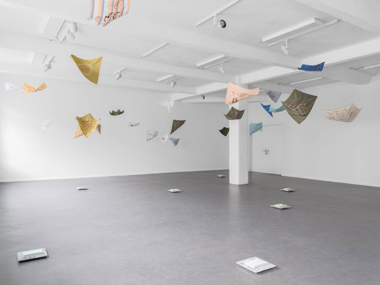 The embroidered works contain drawings, fragmentary notes and questions about the many voices that make their way through a web of quotations. Abstract diagrams referencing an ancient Avestan proverb float alongside fabulous portraits of elemental deities from the Zoroastrian pantheon; a Disney witch, who once triggered a fear of the color purple in Areez Katki, is embedded in mythical retellings from Ferdowsi’s epic poetry. Autofictive micro-stories transcend the figurative and lead to the abstract. Micro-stories transcend the figurative and lead to the abstract. Inspired by Areez Katki’s mother’s work as a stenographer, a shorthand is invented and embroidered in fabric. Areez Katki’s visual language condenses narratives that are imbued with an ethic of love. In them, languages and identities are set in motion – interwoven into flowing forms of queer physicality. Like the thoughts of a restless mind, like memories of a complex past, these works hang in the space in subtle disorder – floating, vulnerable and open to close observation.