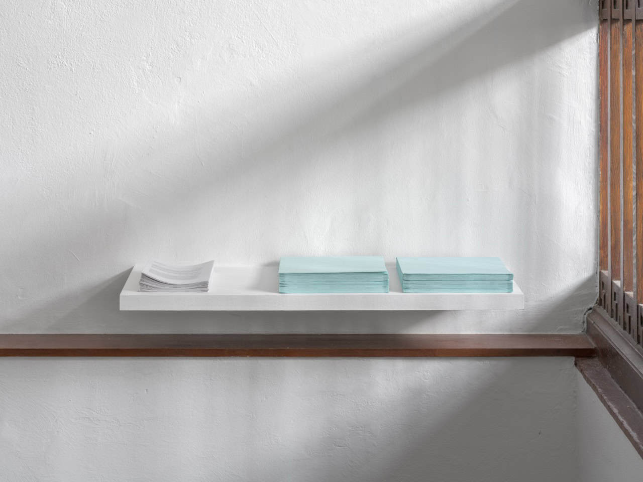 Writing itself extends in many directions: Every attempt to experiment with language begins as a failure, with only tenuous outcomes. Suspensions is an eleven-part text-based work consisting of autofictional fragments, poems, letters and essays – micro-stories that are loosely connected to the visual and sonic works in the exhibition. The eleven unfinished drafts appear in A5 booklets on stone plinths – the audience is invited to view them like editors, collecting, permeating and exploring the intertwined narrative strands, voices and temporalities that Areez Katki is mapping on the way to an experimental novel.