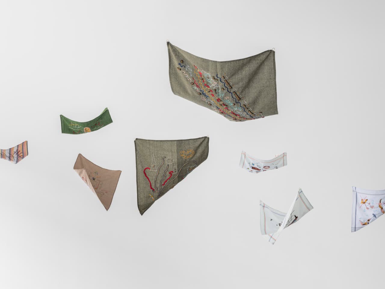 Areez Katki’s apartment in Mumbai is an archive of disparate narrative strands spanning four generations on the matrilineal side of the family. The current occupant sits uneasily in her grandmother’s armchair, chain-smoking. Memories pour fragmentarily into spatial encounters. Found and preserved textiles are revitalized by meditative hand embroidery created directly in the apartment. The textiles float in space as sculptural gestures – they capture the artist’s handiwork and at the same time elude linear access to time.
