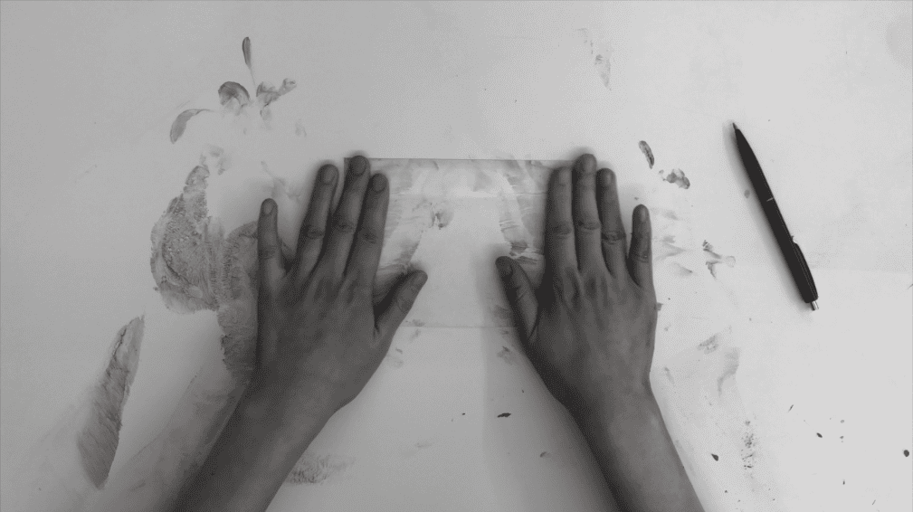 The focus moves from written language to a performance. The movements themselves are recorded, rather than the information. Ink is applied on the left hand holding the paper and on the right hand writing. Traces of the hands’ motions on both the desk and the paper appear. The original purpose, delivering information of this will for the future, is lost, as only I know what was to be written. – Seulki Ki