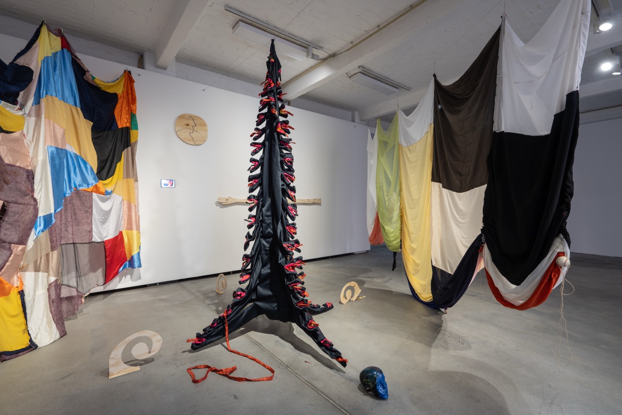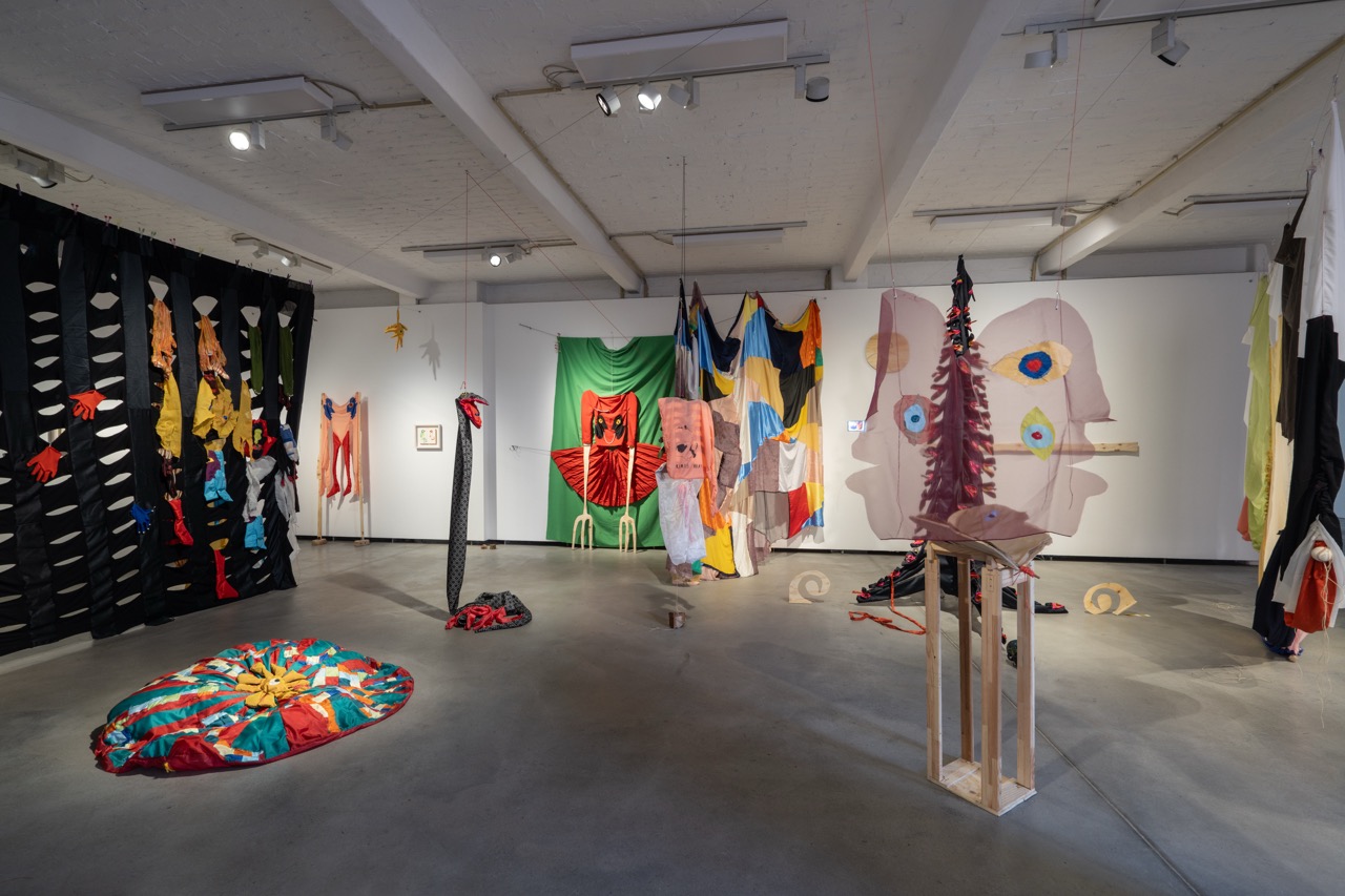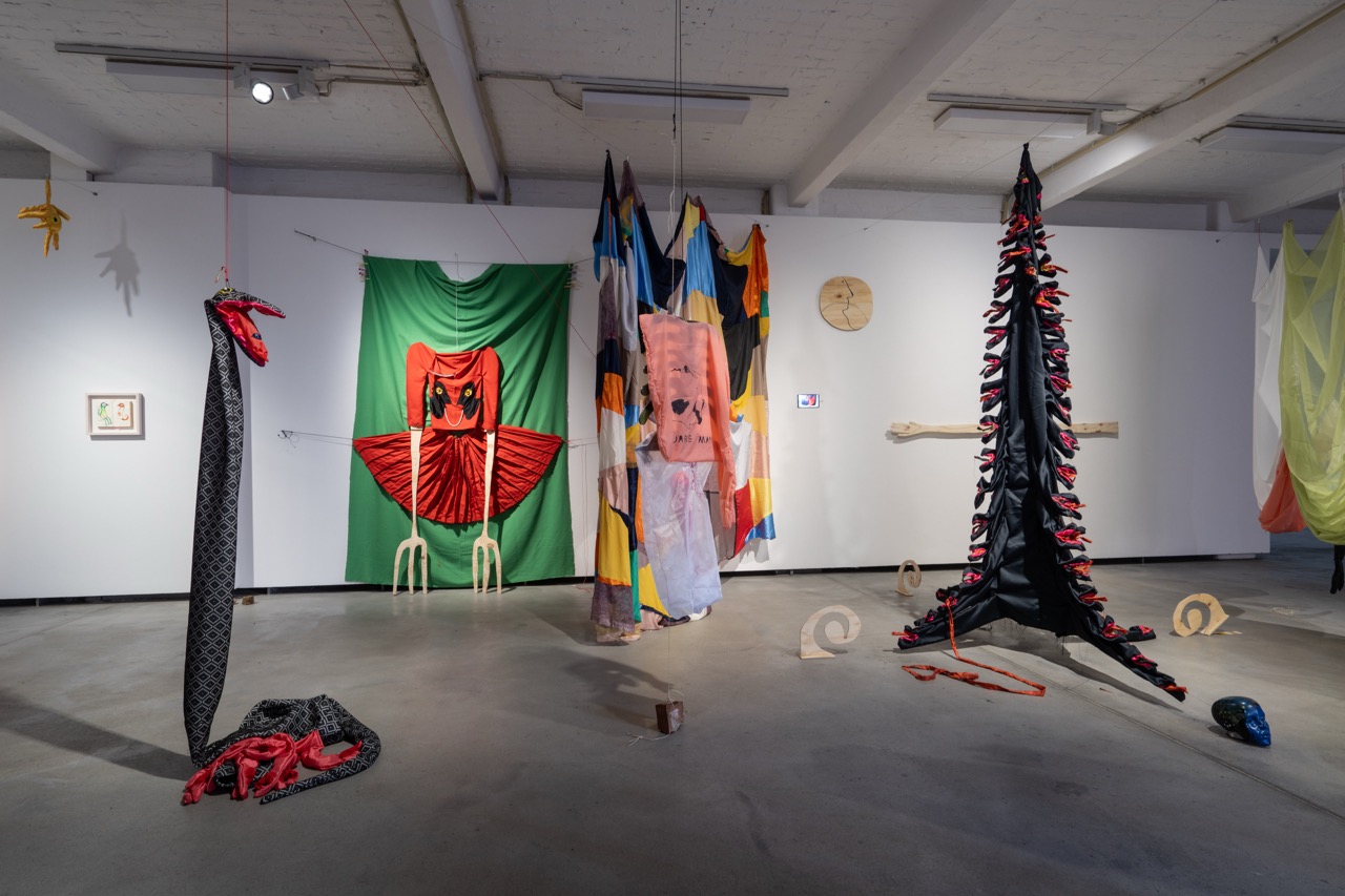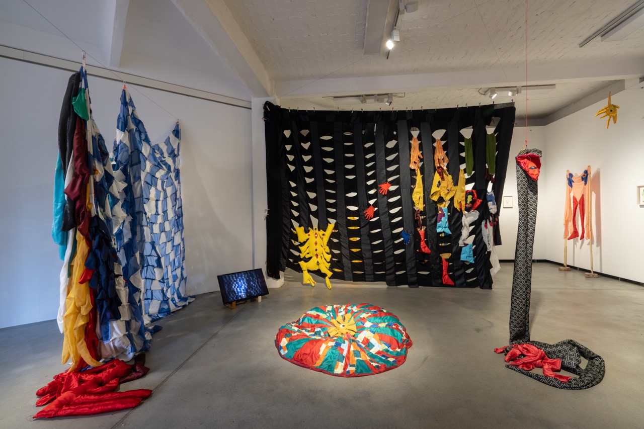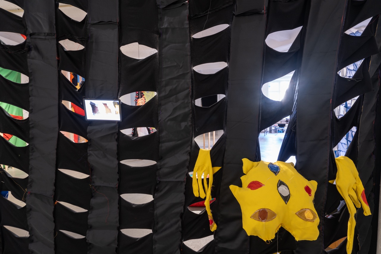 When installed in the gallery, the textures of Avissar’s fabric installations are immediately seductive. They conjure innocent fancy whose pleasant cacophonies of color would not be out of place in a comedy pantomime. Hanging textile backdrops, its patchy patterns resembling camouflage, frame the exhibition space. They seduce entrants into a carefully orchestrated game of surrender and make-believe.