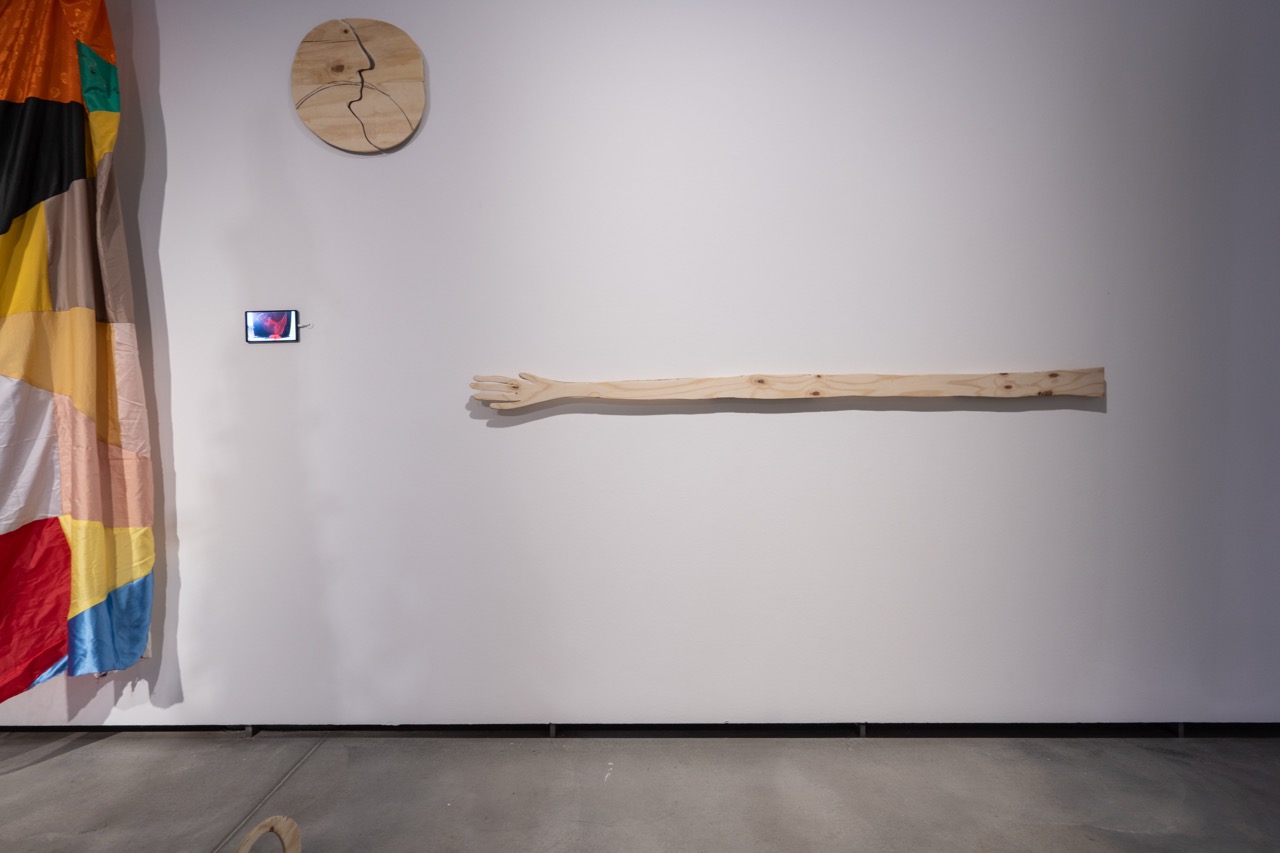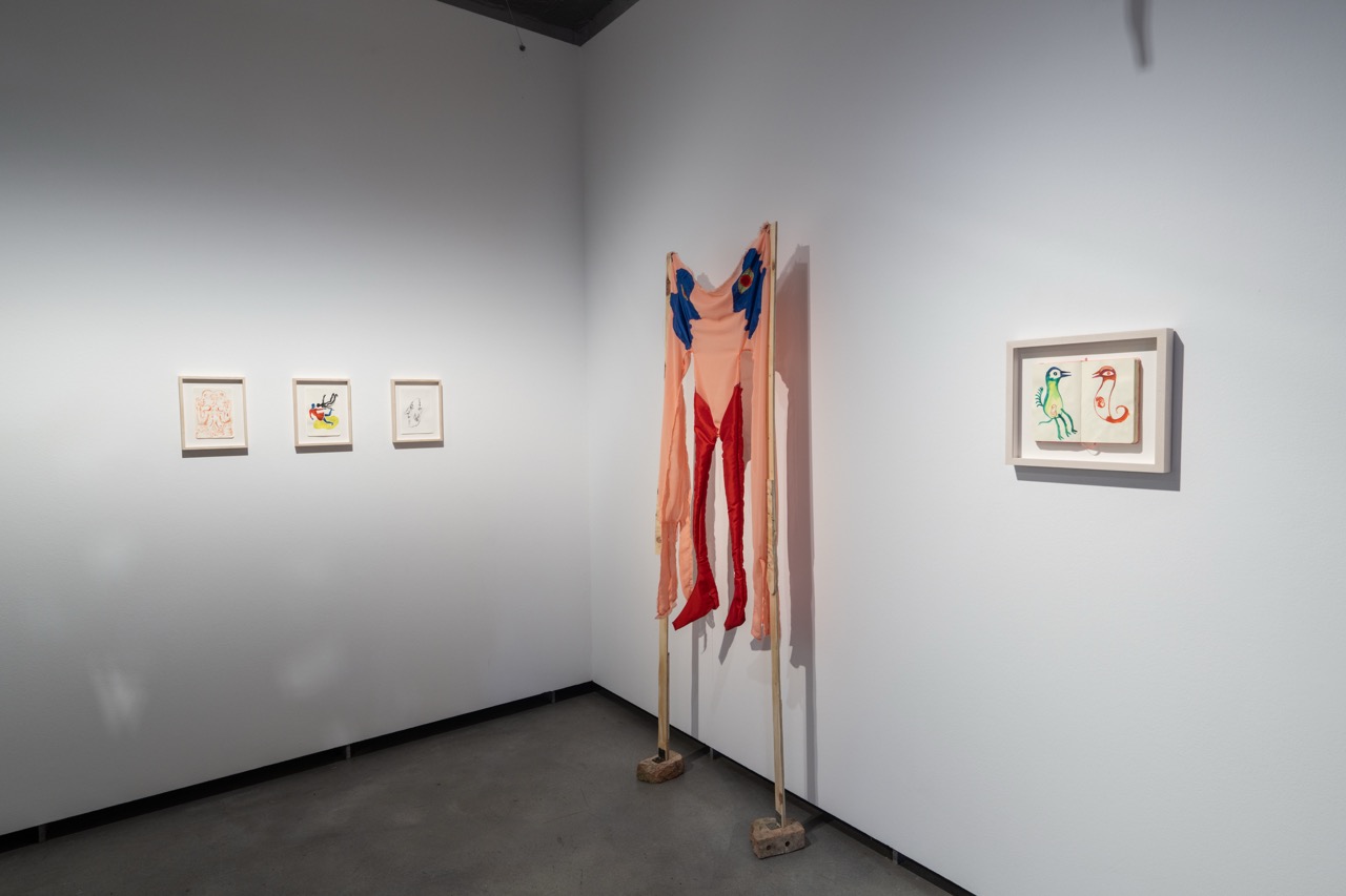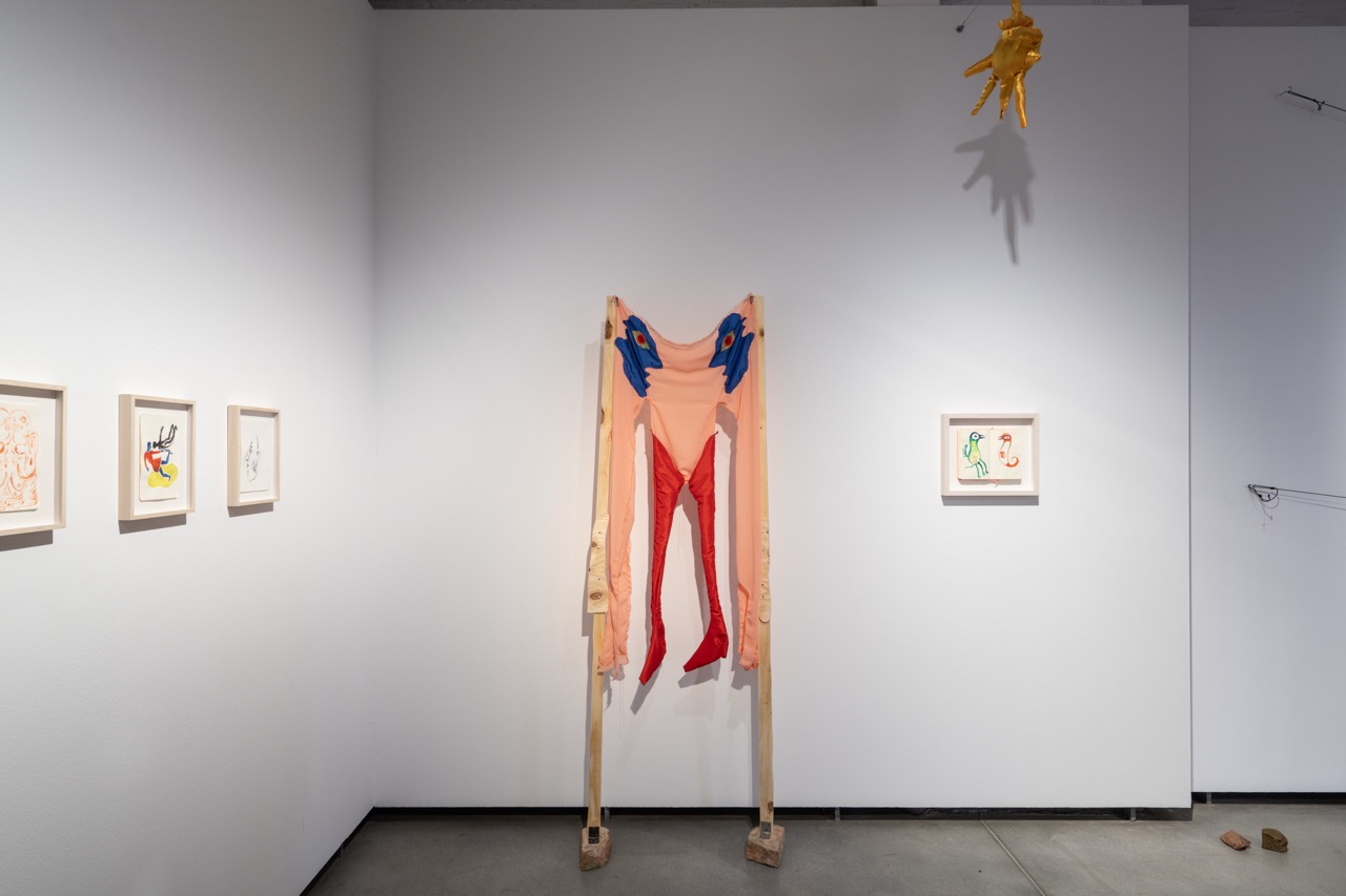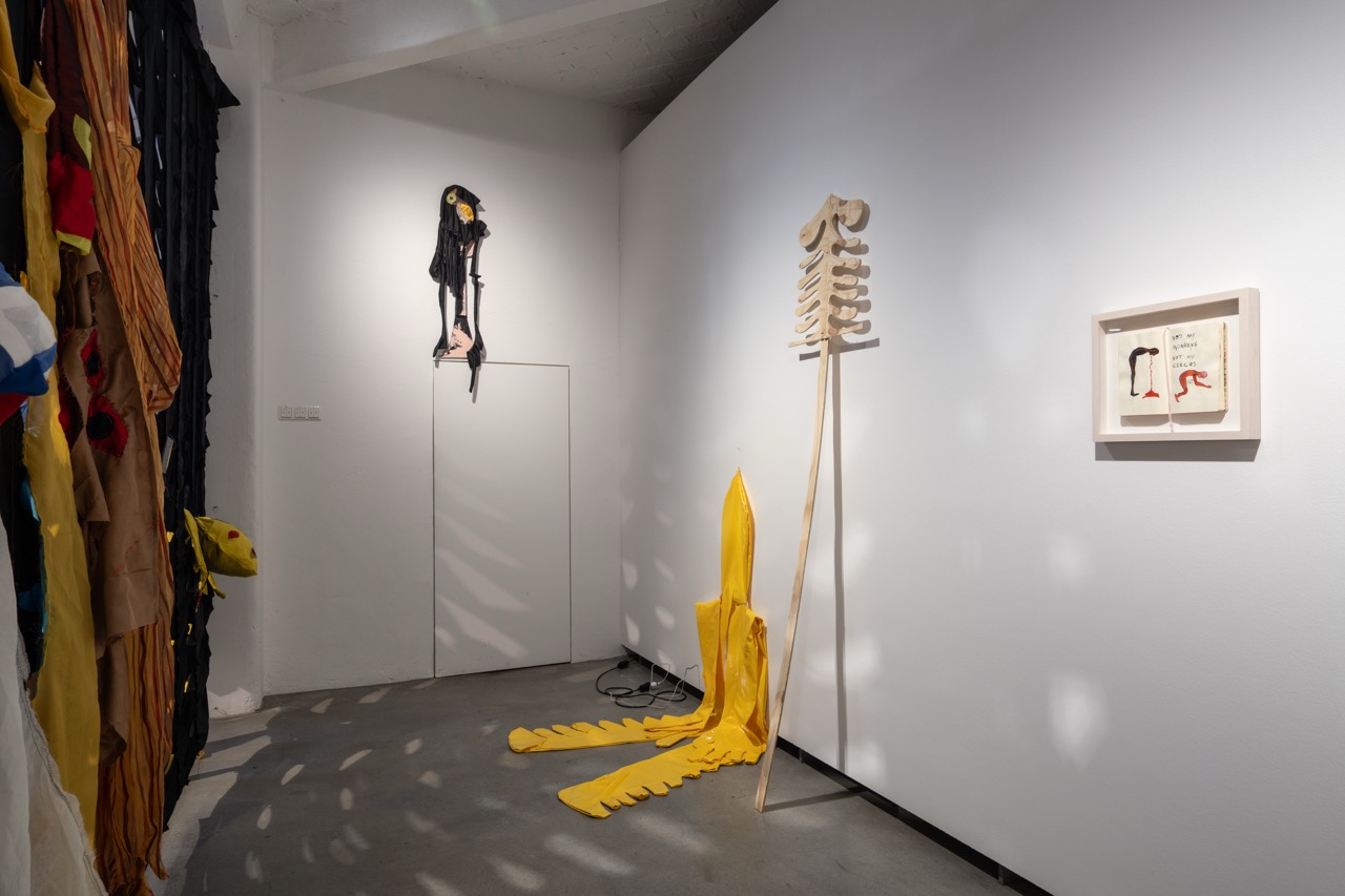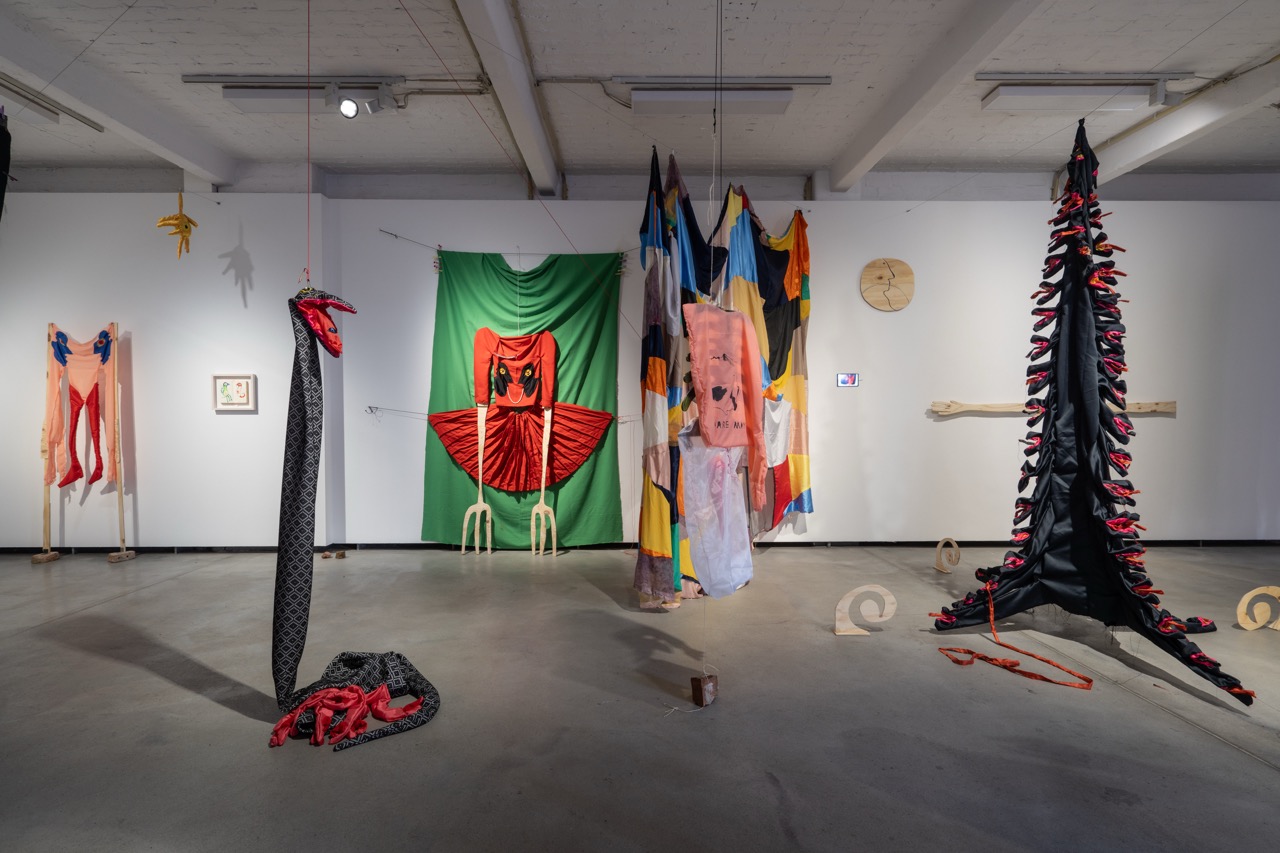 When installed in the gallery, the textures of Avissar’s fabric installations are immediately seductive. They conjure innocent fancy whose pleasant cacophonies of color would not be out of place in a comedy pantomime. Hanging textile backdrops, its patchy patterns resembling camouflage, frame the exhibition space. They seduce entrants into a carefully orchestrated game of surrender and make-believe.