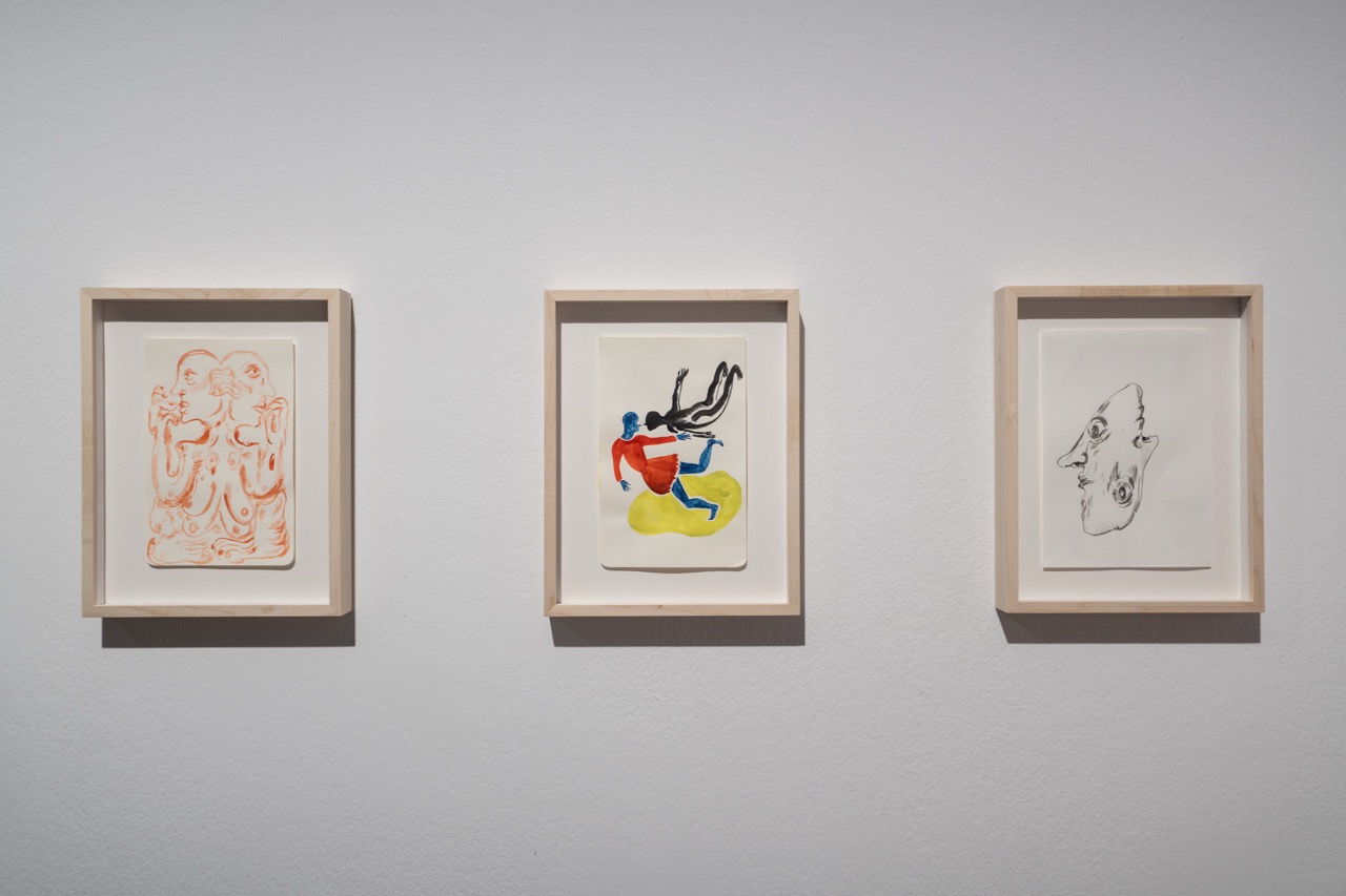 A witness to this scene might notice that the draperies are not merely the innocent shrubbery of the fairytale copse. Each is also a costume for Avissar and his many doubles to hide in. Masks, sock-puppets, and cloth sacks offer the artist the perfect vantage to assess his audience, before turning them into the prey of his corruption. One of these creations turns him into that lascivious man lurking behind a tree stump. Another—as if there were a difference—makes him the snake in the Garden of Eden. The ultimate duplicity is that he remains an artist in each.