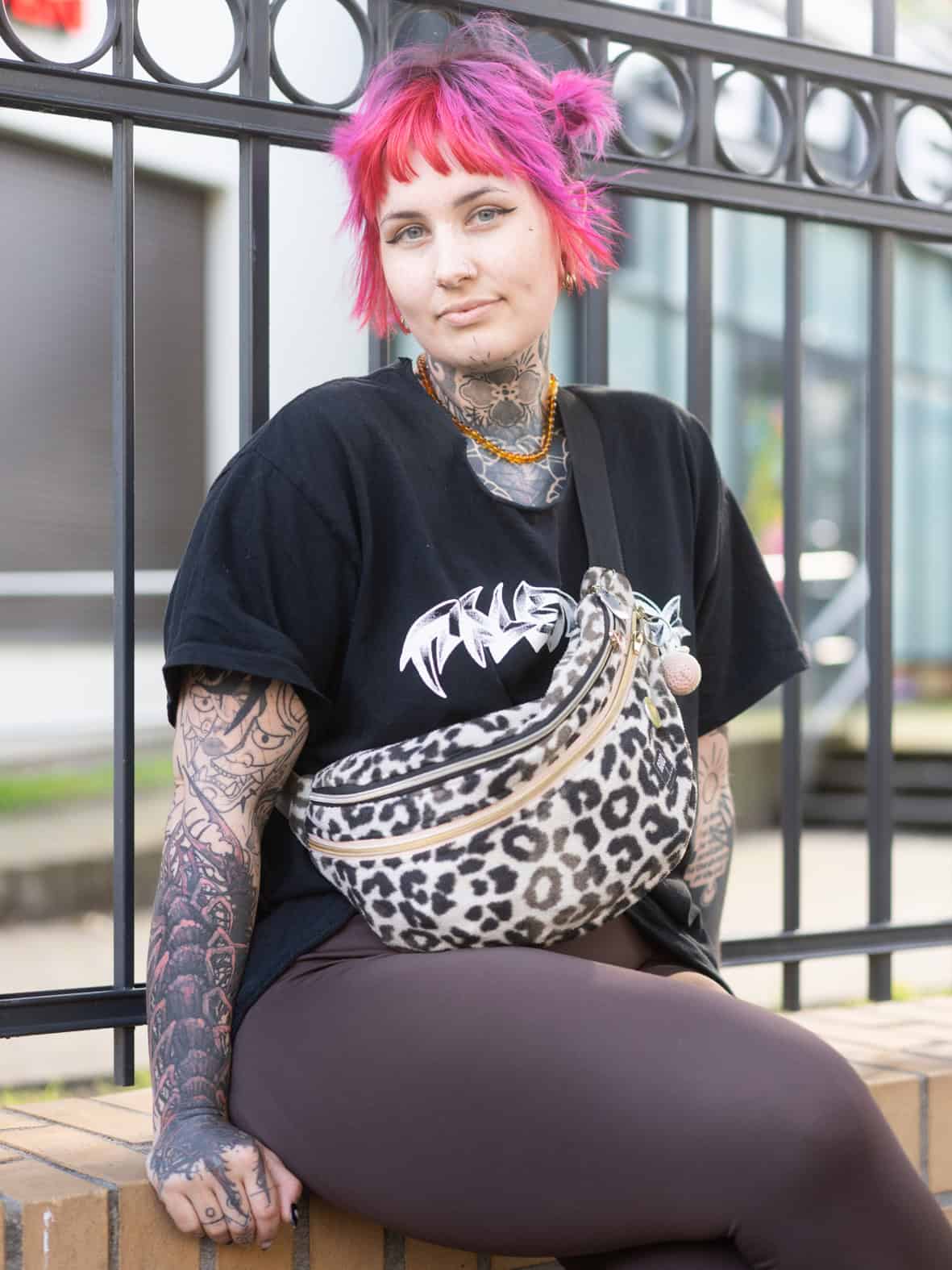 Die so entstandenen Porträts sind auffällig klar und zurückgenommen. Die Figuren heben sich mit stiller Würde gegen die unscharfe Geometrie der Berliner Architektur ab. Das Objektiv vor dem Auge des Künstlers schafft eine Wechselseitigkeit des Blicks: weder Überwachung noch Performance, sondern Präsenz. Wie ein rhythmischer Puls der Serie wiederholt sich der Leopardendruck auf Jacken, Schals und Kleidern. Es ist zugleich Zeichen und Tarnung, Ausdruck von Individualität, aber zugleich ein Echo des kollektiven Stoffs, aus dem die Stadt ist. Mit der bildlichen Wiederholung macht Peng Yi-Hang aus dem Muster eine Metapher, einen Hinweis darauf, dass Identität vielleicht am lebendigsten dort existiert, wo Unterschiede sich aneinander annähern.