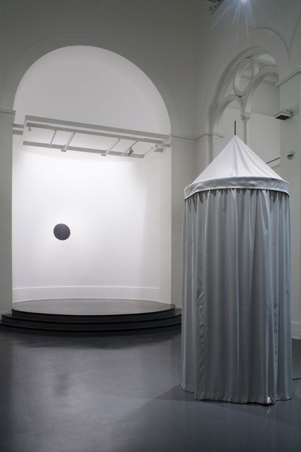 „Ralf Ziervogel ist bisher bekannt für detailscharfe, im- und explodierende apokalyptische Zeichnungen im Über- und Miniformat. Die Rauminstallation „Equilibrist“ ist minimalistisch stringent dem vorgegebenen Raum, dem vormaligen Kirchenraum des Krankenhauses Bethanien, heute Studio 1 des Künstlerhauses, eingepasst. Ein fast körperlicher Modellaufbau aus UD (2007, 384 x 150cm, mixed media), der Schlagapparatur unter grauem Zeltstoff und einem blinden Fleck, tiefschwarz und matt, aus reinem Elfenbeinschwarz, in der Apsis platziert. Der Raum spiegelt eine Arena als Objektraum wieder. Zu allem besteht Distanz. Das Innere des Zeltes beschleunigt sich randomartig als plastische Form nach außen. Man meint, Bud Spencer und Achilles stehen auf einer Schildkröte. Das schwarze Loch in der Apsis ist der Zusammenzug des Innenraumes, das Gegenüber des Zeltes. Ohne Pathetik stellt sich die Frage nach Außen und Innen, nach dem Verursacher, der Leerstelle eines höheren Wesens.” (Peter Lang, Kurator)